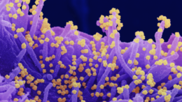 Scanning electron microscope image of SARS-CoV-2 (round gold particles) emerging from the surface of a cell cultured in the lab. Image captured and colorized at Rocky Mountain Laboratories in Hamilton,…