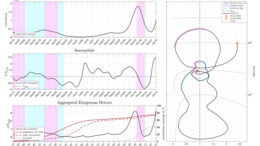 Diagram top left: Course of active case numbers Diagram middle left: Susceptible proportion of population Diagram bottom left: Aggregate exogenous drivers including course of vaccination rates. Courtesy of TU Wien…